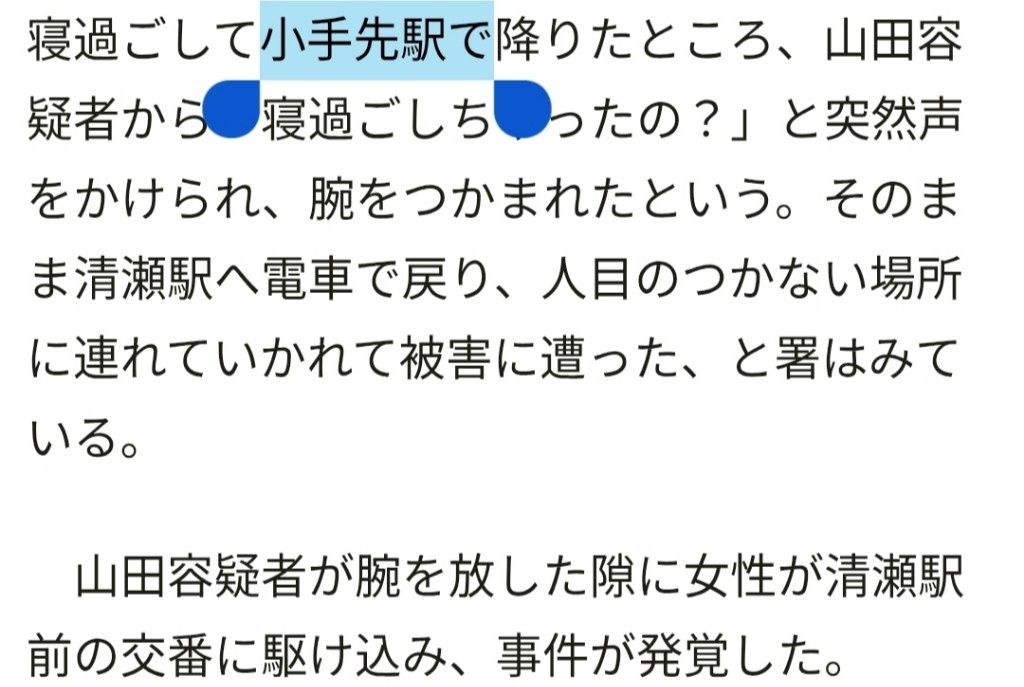女性は西武池袋線清瀬駅に向かうつもりが寝過ごして小手先駅で降りたところ、山田容疑者から「寝過ごしちゃったの?」と突然声をかけられ、腕をつかまれたという。そのまま清瀬駅へ電車で戻り、人目のつかない場所に連れていかれて被害に遭った、と署はみている。