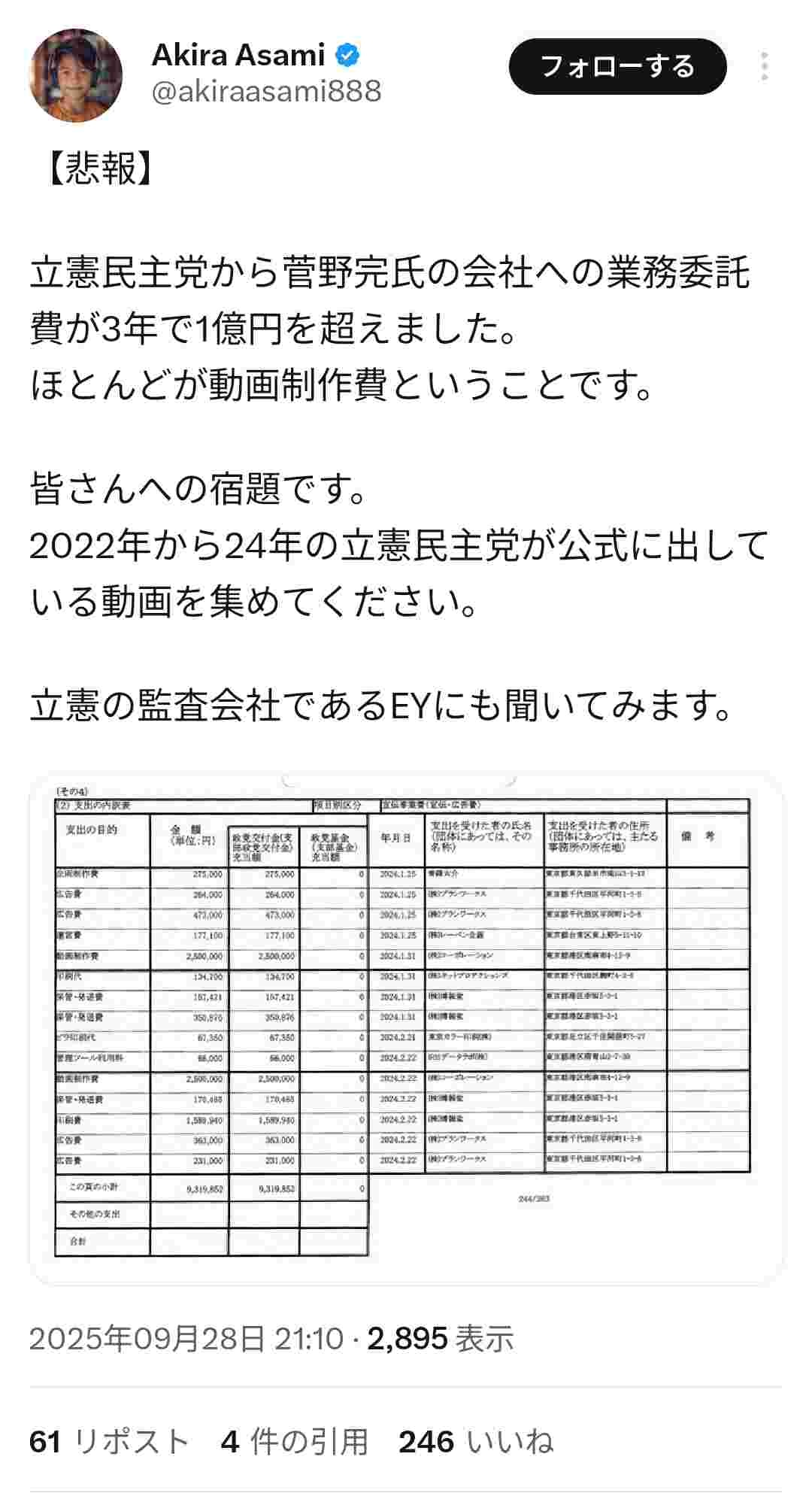 立憲民主党から菅野完氏の会社への業務委託費が3年で1億円を超えました。