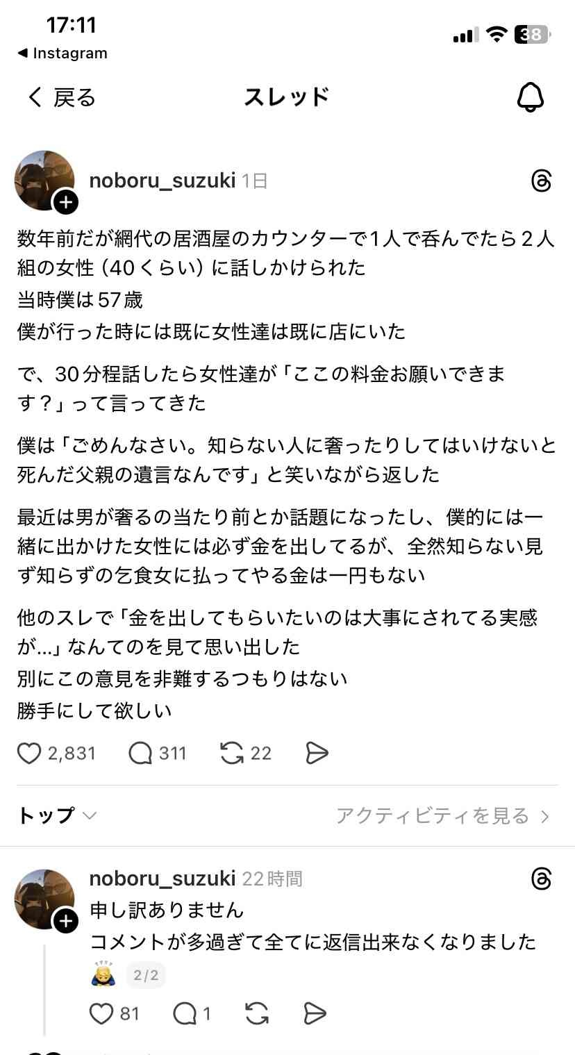 それを奢らずにしかもぐちぐちとネットに書く