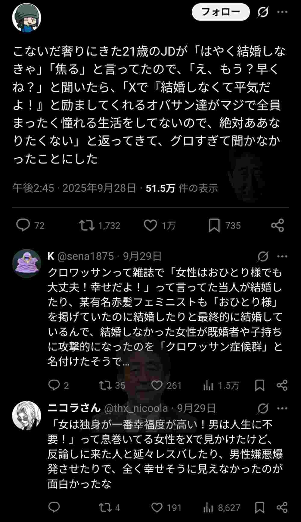 ツイッターで暴れてる「幸せな独身女性」は知識人ぶって愛国を語るネトウヨと大差ない