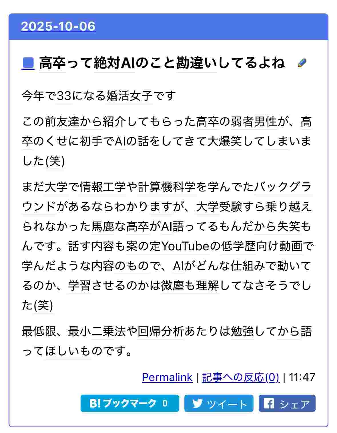 リケジョ「高卒のくせに『AI』を語ってる弱者男性ってなんなの?最小二乗法も知らない高卒がAI語るなよ