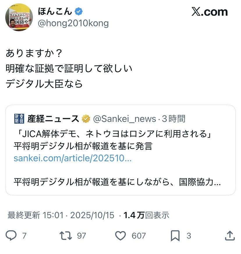 デジタル大臣「ネトウヨはロシアに利用される」→ほんこんさん、ブチギレ「証拠出して」