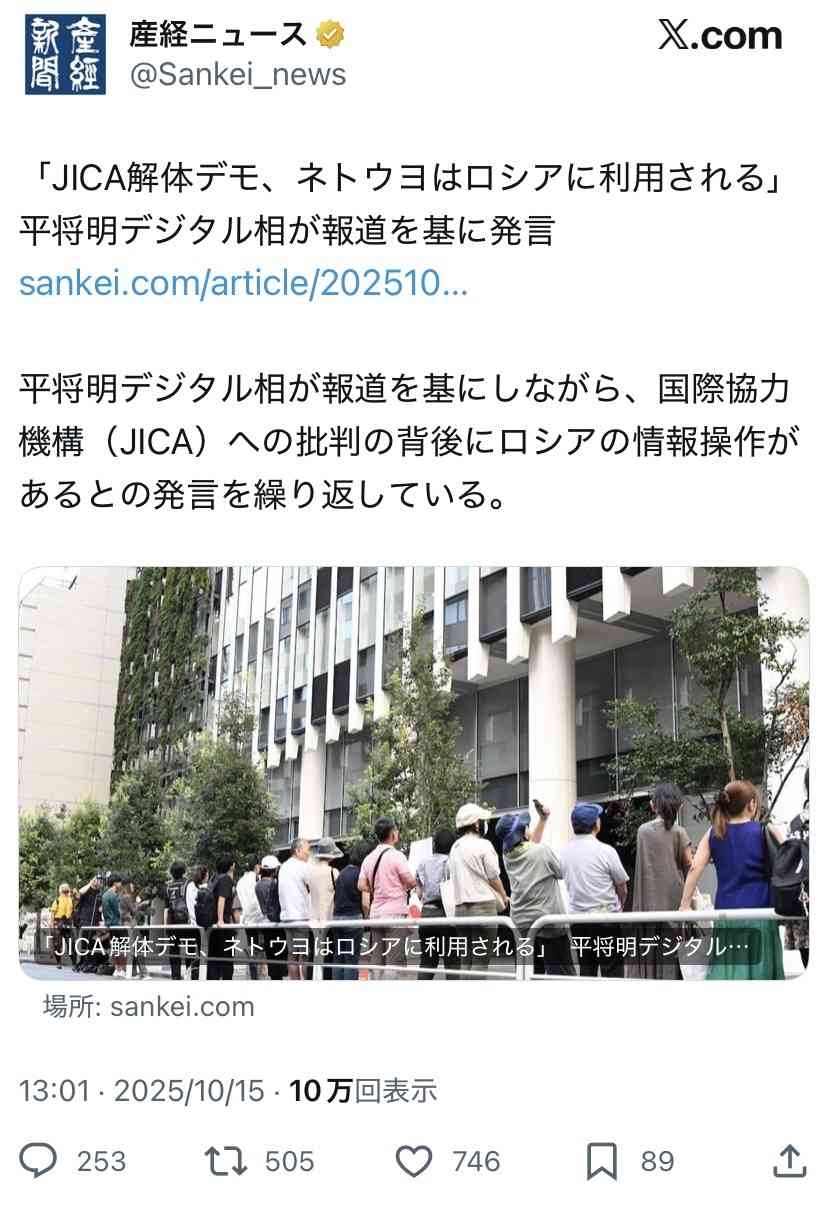 平将明デジタル相が報道を基にしながら、国際協力機構(JICA)への批判の背後にロシアの情報操作があるとの発言を繰り返している。しかし、報道が依拠する「政府の調査」の詳細や真偽は不明だ。