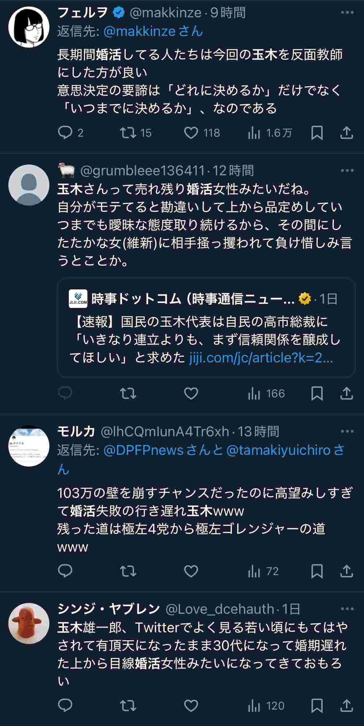 玉木雄一郎、Twitterでよく見る若い頃にもてはやされて有頂天になったまま30代になって婚期遅れた上から目線婚活女性みたいになってきておもろい