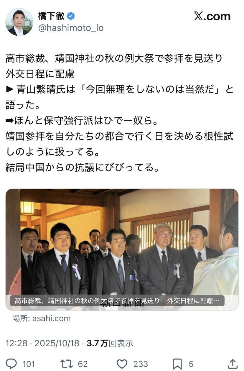 高市総裁、靖国神社の秋の例大祭で参拝を見送り 外交日程に配慮:朝日新聞自民党の高市早苗総裁は17日、東京・九段北の靖国神社の秋季例大祭に合わせた参拝を見送った。首相就任が確実となるなか、月末に控える外交日程などに配慮した。一方、閣僚を務めていた時期も春と秋の例大祭や終…www.asahi.com