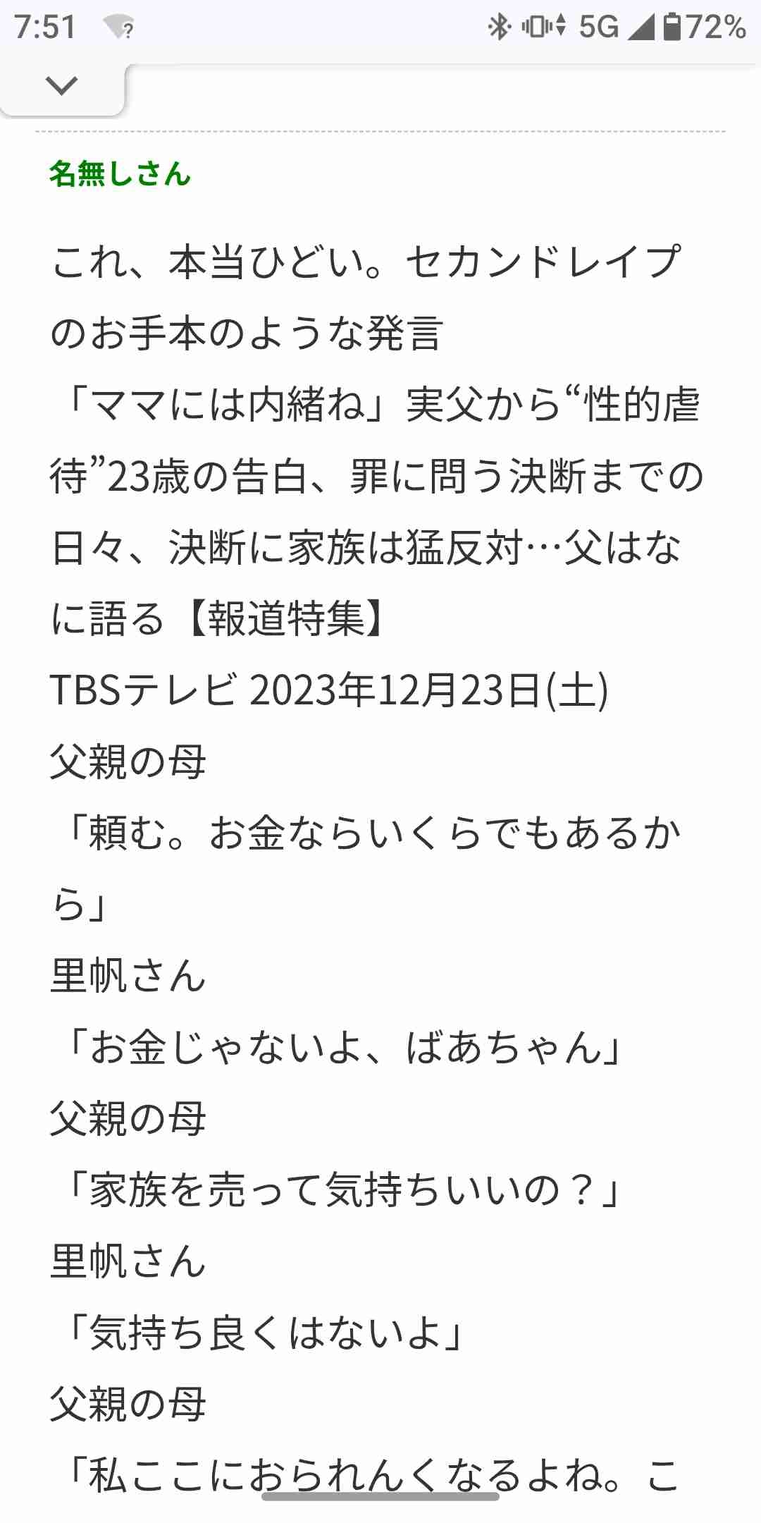 この女性は実名顔出しで父親を告発した訳だけど、もしこの女性が将来、男児を出産したとしたなら、「あの男の子には実の娘をレイプする性質が覚醒遺伝している」とかいう陰口が叩かれないか心配。