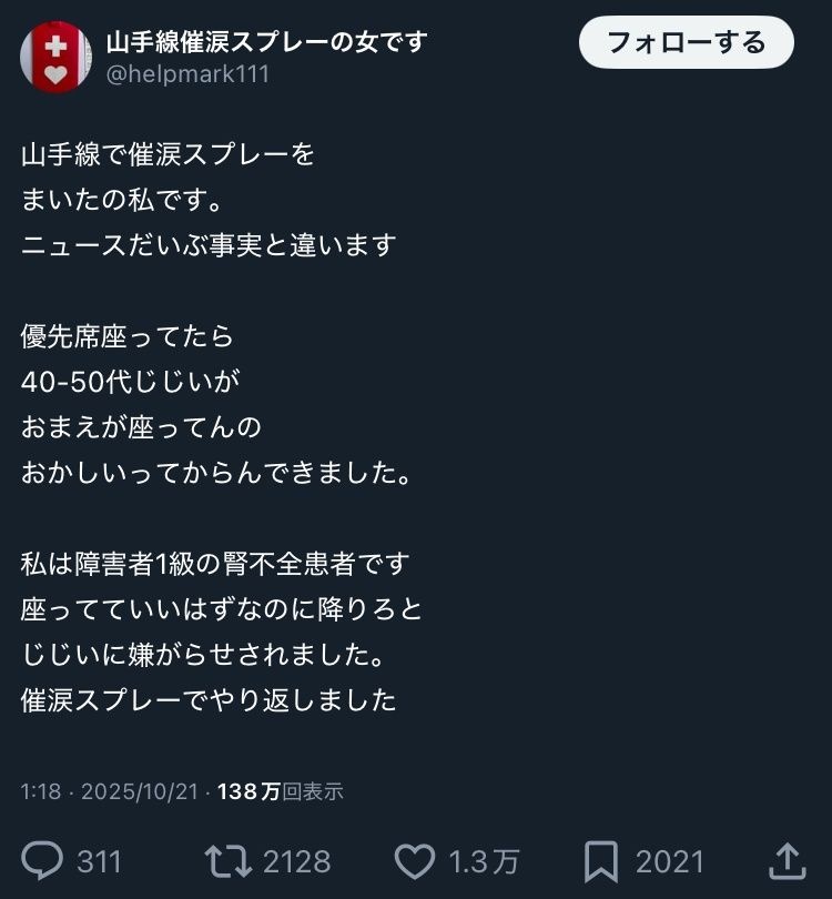 俺も前に優先席座ってたら、ヘルプマーク見せられて席変わってくれって言われた事あるよ