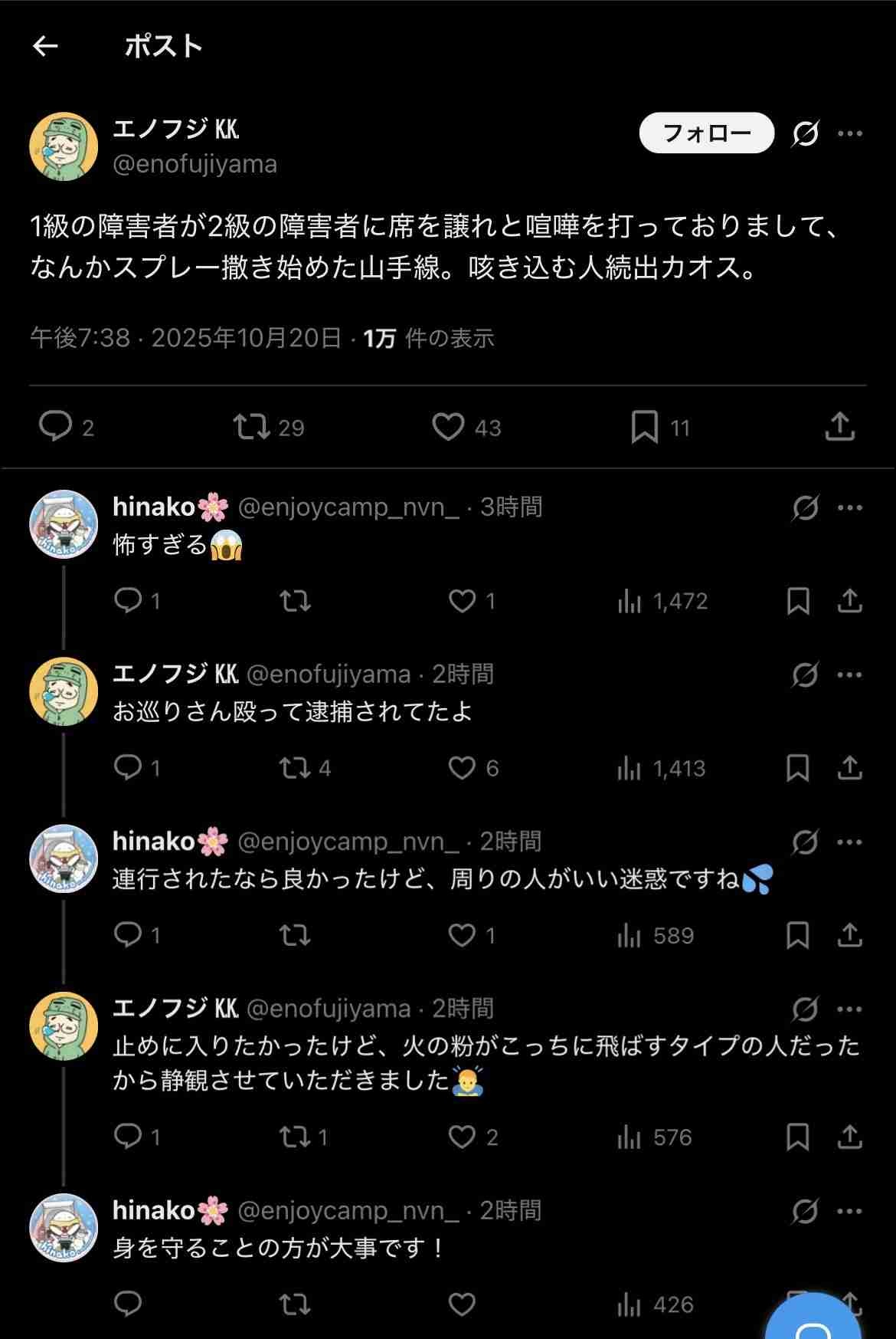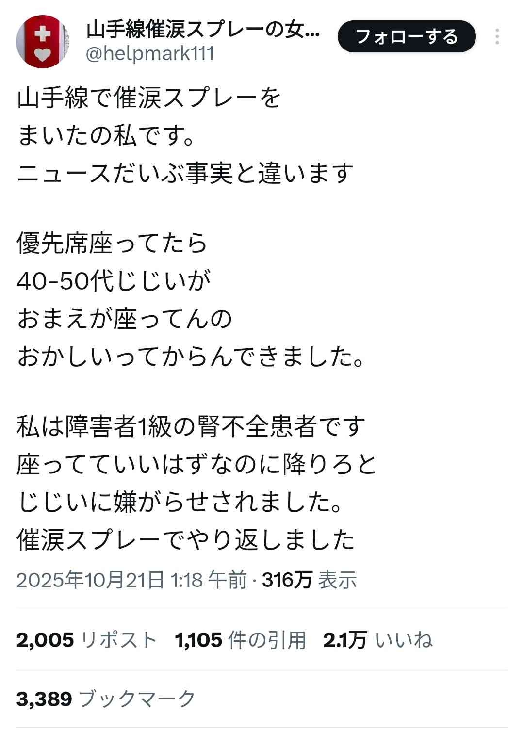 電車内でスプレー撒かれたら逃げ場ないから巻き添えがかわいそう