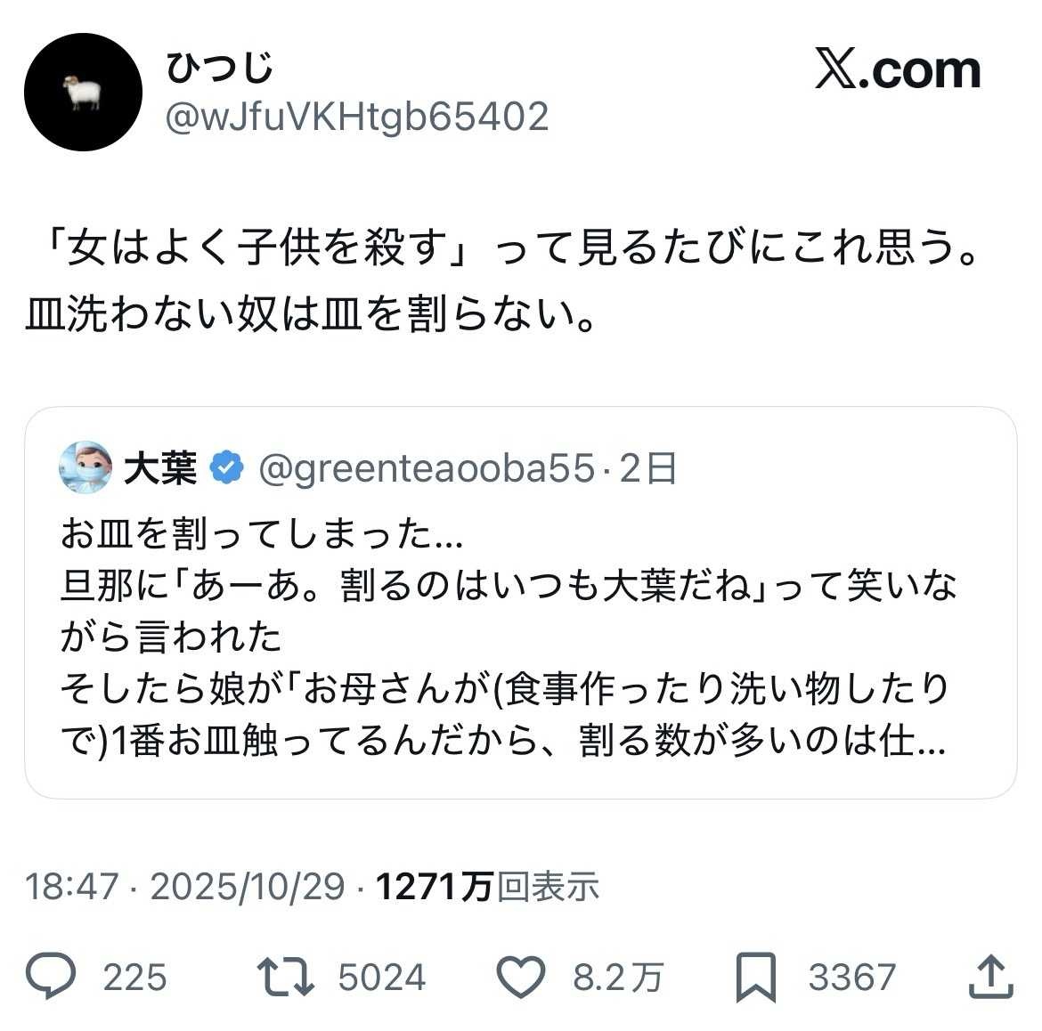 男がこういう例えしたらクソフェミは「赤ちゃんを皿と同じにすんな😡😡」ってクソだるい絡み方してくるよね