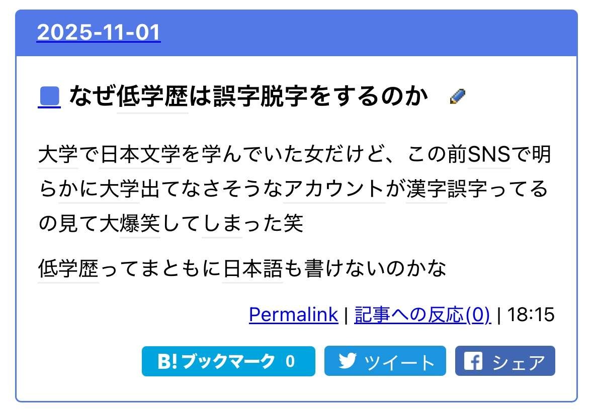 大学で日本文学を学んでいた女だけど、この前SNSで明らかに大学出てなさそうなアカウントが漢字誤字ってるの見て大爆笑してしまった笑