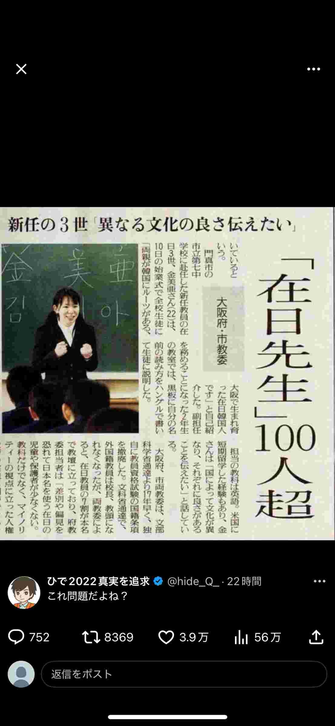 在日が義務教育の教員ってことならたしかに問題ある