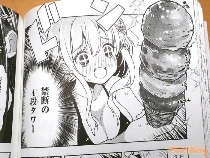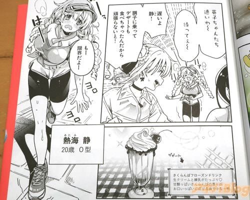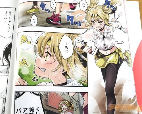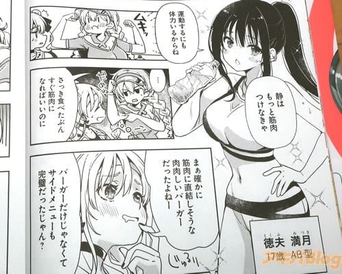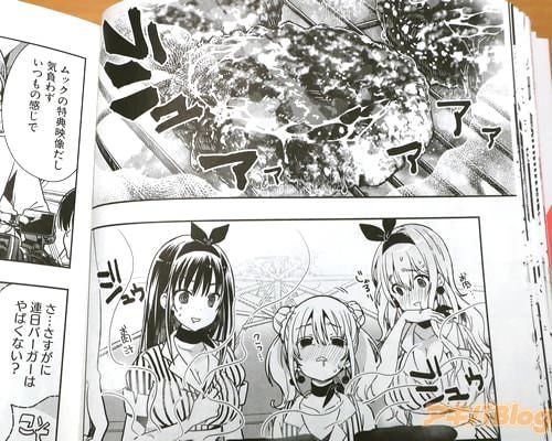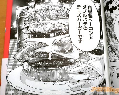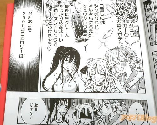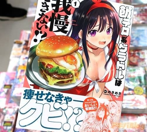 今回発売になったコミックス「飯テロ系グラドルは我慢できない!?」1巻【AA】には、第1話~第4話の「ベーコンチーズダブルバーガー」・「近江牛のすき焼き」・「アイスクリーム」・「袋ラーメンとふわふわ卵」と、描き下ろし「静と大食い動画」を収録(もくじ)し、販促POPは『痩せなきゃクビ!崖っぷちなのに…』、裏表紙は『魅惑的な少女たちに――。食欲そそるご飯たちに――。もうよだれが止まらないっ』で、オビ謳い文句は『痩せなきゃ――クビ!?崖っぷちグラドル3人組のおいしい奮闘記!』になってた。