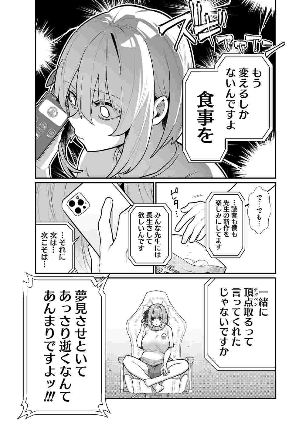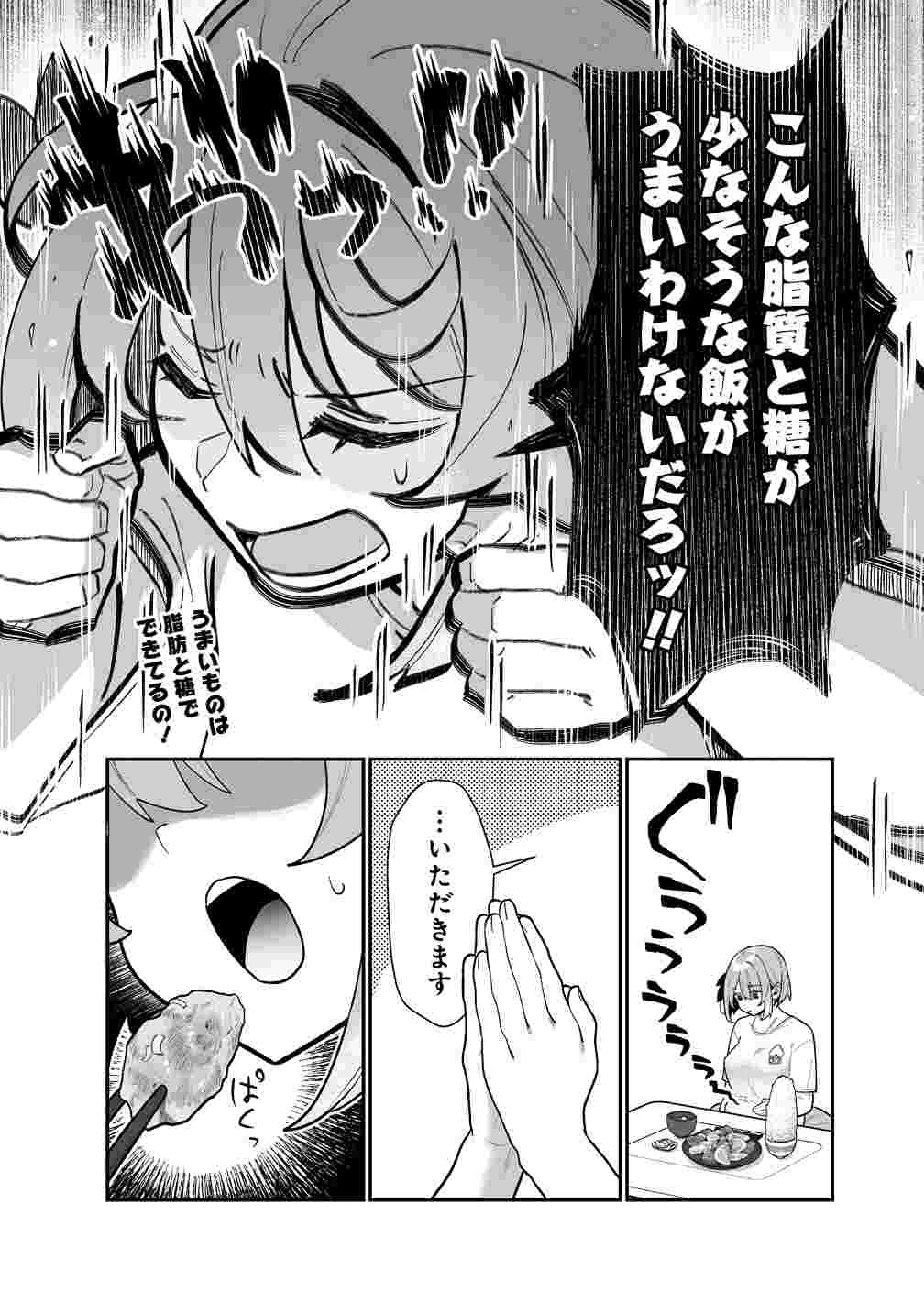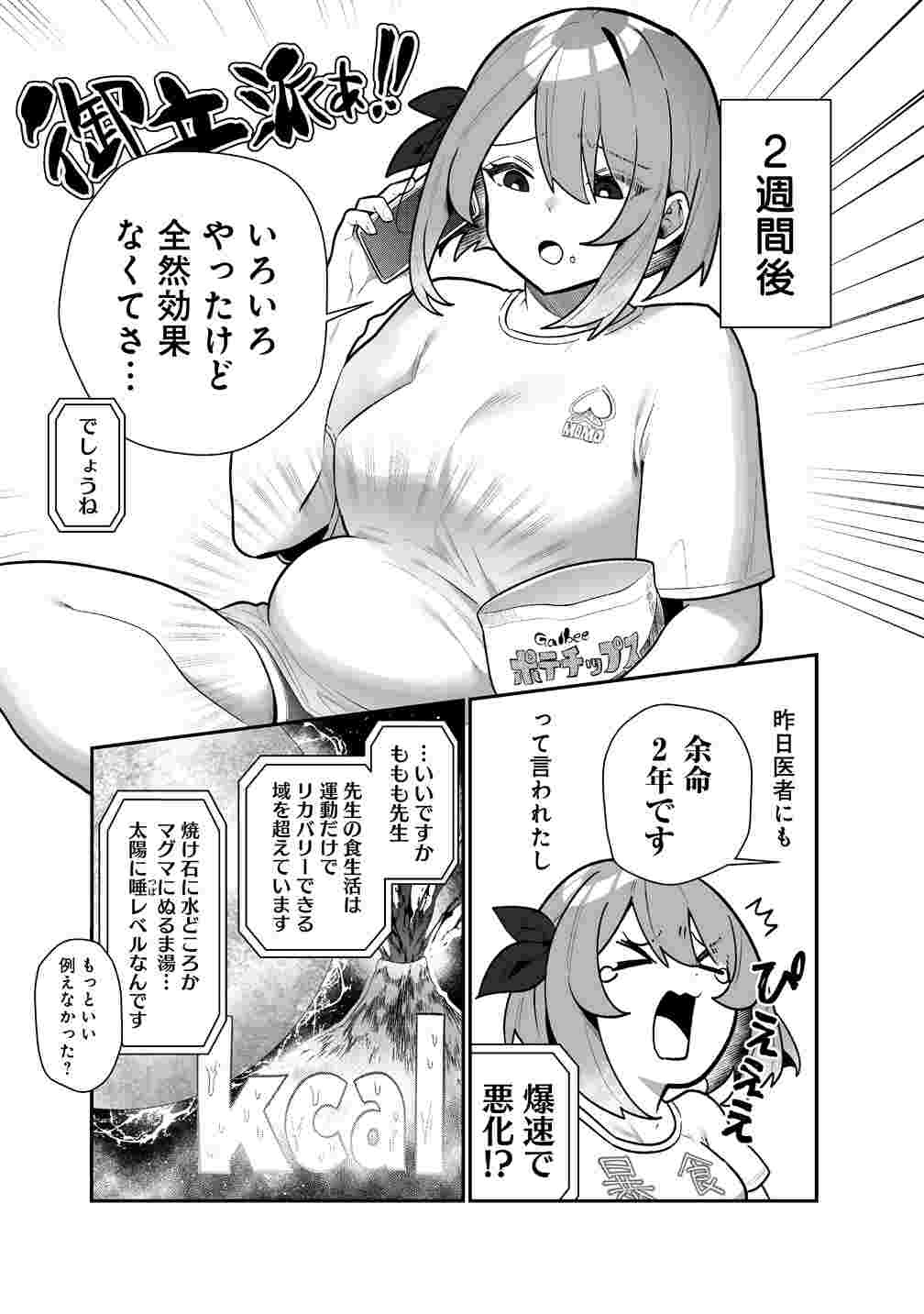 同作の主人公・桃川もももは、暴飲暴食を続けた結果余命3年と医者から宣告されてしまった不摂生マンガ家。普段どんなものを食べているか聞かれ「マックに爆盛りチーズとハンバーグを枚数加えて魔改造したものとか」「単純にバターを揚げたやつとか」と告白したもももは、担当編集者に食生活の改善を提案される。「不味い飯を食うくらいなら死ぬ」という態度のもももだったが、爆速で余命が2年に悪化。仕方なしに担当に教えられたメニューを試してみたところ、高タンパクなのに美味しく満腹感もあり、なかなか悪くない。医者や担当を見返してやることをモチベーションに、怠惰な性格の女性マンガ家が健康目指して奮闘する姿が描かれる。