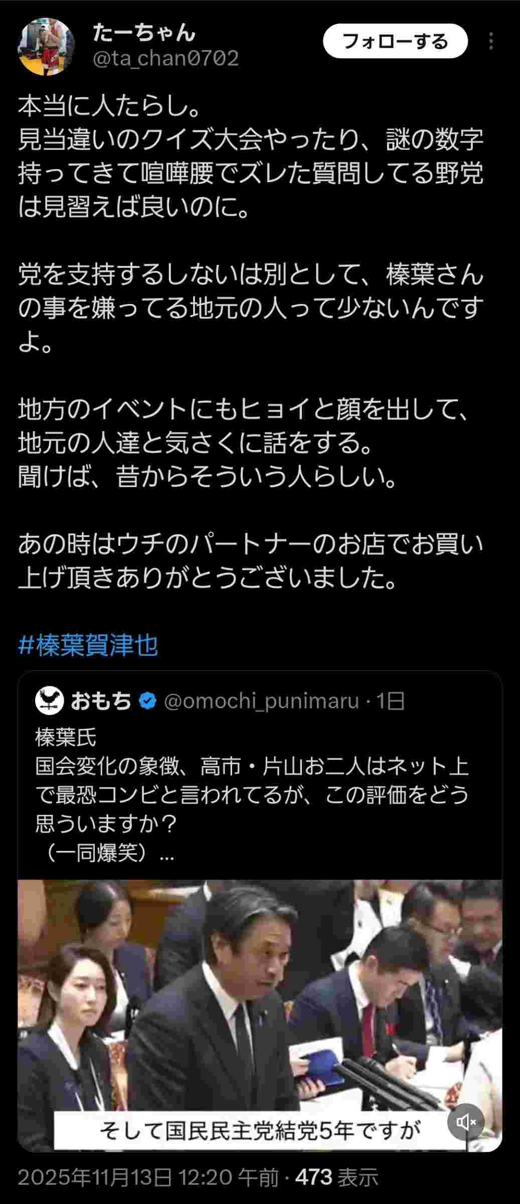 https://news.livedoor.com/article/detail/29980648/高市政権になり、国会中継に国民の関心が高まっている。12日の参議院予算委員会では、国民民主党の榛葉賀津也幹事長(58)が高市早苗総理(64)に対し、突然の“連想クイズ”を出題する場面があり、SNSでも話題になっていた。