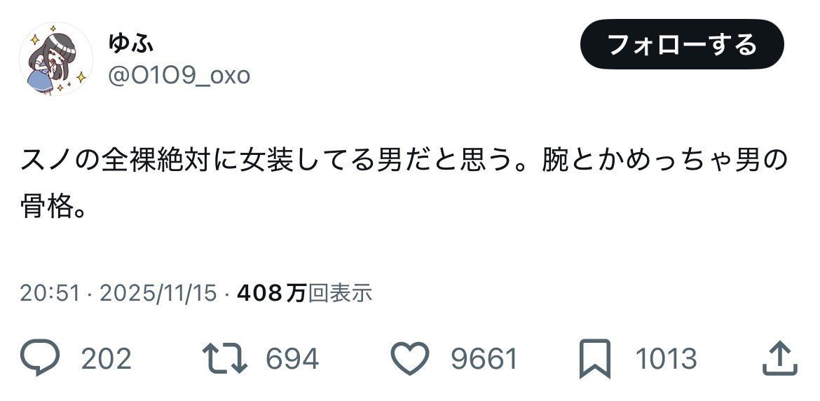 https://www.zakzak.co.jp/article/20251117-4H4PPCWXYVGS7E3OEAYXU2AAMI/Snow Manのライブにおける全裸参戦事案を巡っては、女装・男説も飛び出している。当時の様子だとされる動画を見たユーザーから、「スノの全裸絶対に女装してる男だと思う。 腕とかめっちゃ男の 骨格」「全裸ペンラの人ほんとに女なんかな?毛量やばすぎてカツラ被った男かと思ってるんやが」という主張も飛び出しているのだ。