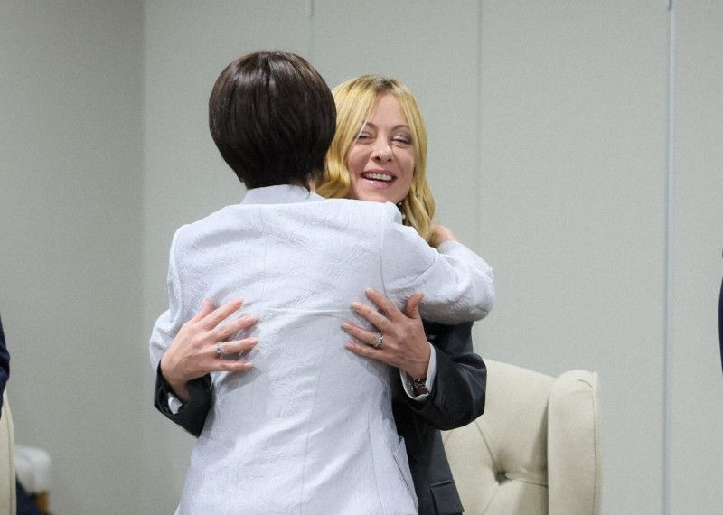 南アフリカ・ヨハネスブルクで22日に開かれた会合でイタリアのメローニ首相(奥)とハグする高市早苗首相=内閣広報室提供