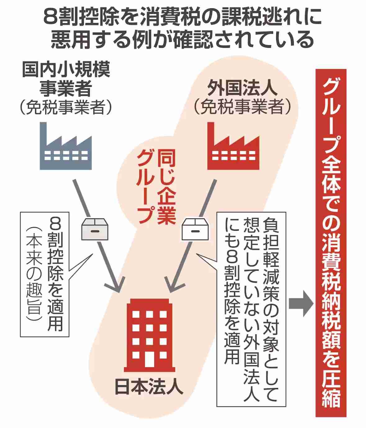 売上高が1000万円以下で、課税事業者に登録していない免税事業者はインボイスを発行できず、8割控除は本来、こうした事業者が取引から排除されるのを防ぐための措置だ。ただ関係者によると、企業が同じ企業グループの免税事業者である外国法人から仕入れを行う際に適用している例があるという。