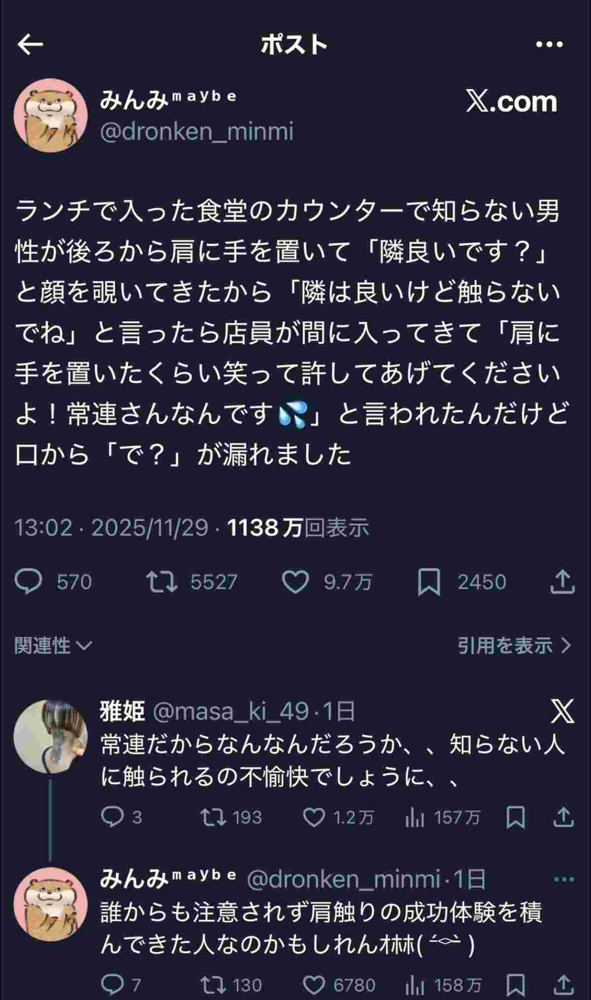 俺でも突然肩触られたら何だコイツとは思うけど一方で肩ポンがセクハラなのかというと確かにうーんと思わないでもない