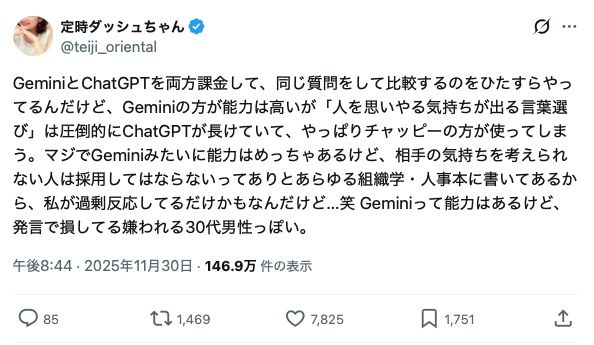 女性ユーザー「Geminiって能力はあるけど発言で損してる嫌われる30代男性っぽい。」