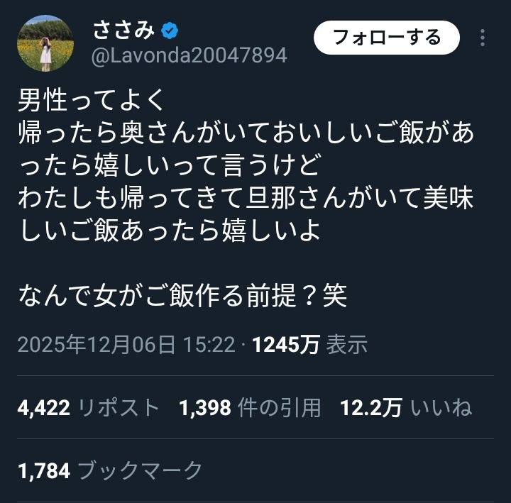 女さん「帰ったら奥さんにご飯作って貰ったらうれしい?あのさぁ…なんで女が作るの?(笑)」→12万いいね!