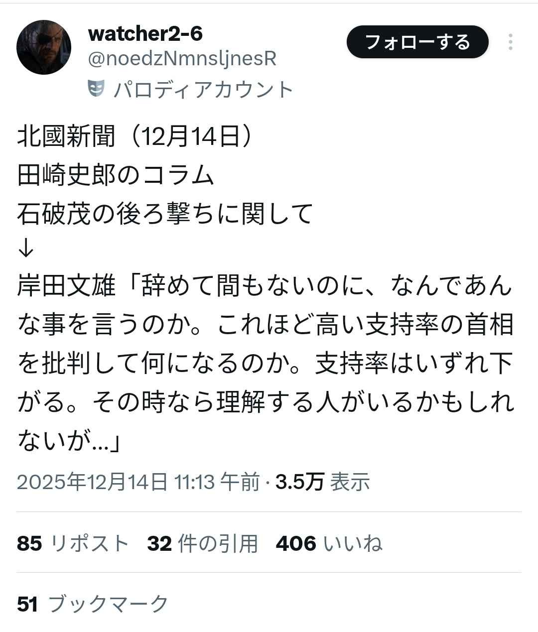 岸田、石破を批判「メチャクチャ支持率高い高市総理をいま批判して何になるのか。支持率下がるの待てばいいのに」
