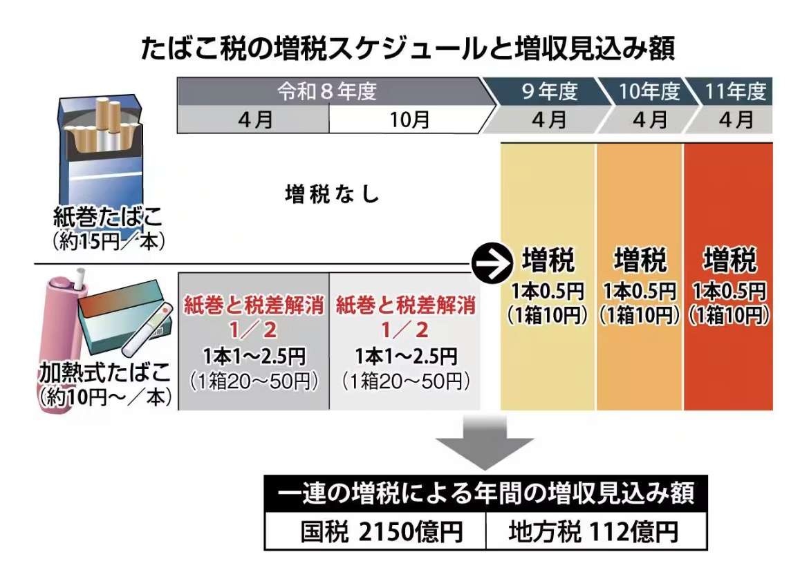 令和7年度の税制改正では、防衛力強化に向けた財源額保のための増税のうち、たばこ税は令和8年4月から順次実施する方針が示された。加熱式たばこの税率を引き上げて紙…