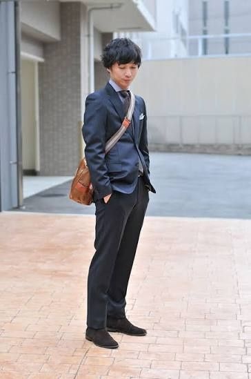 2枚目はネクタイにチーフまでしてライトブラウンのショルダーはチグハグすぎる