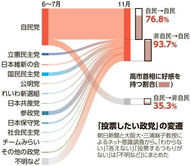 高市氏に好感「自民に投票」大幅増 参政などから流入、朝日阪大調査(朝日新聞) - Yahoo!ニュース