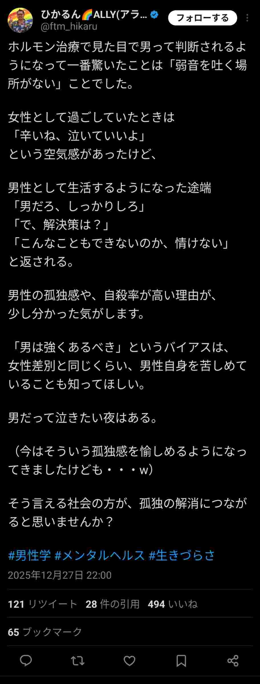 FTMが「男の孤独」「男の生きづらさ」を「発見」するのに対し