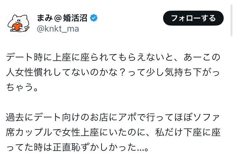 婚活評論家「下座に座らされた時点であなたの負け」「男性にその程度だと思われてるという事なので恥ずかしいと感じた感覚自体は正しい」