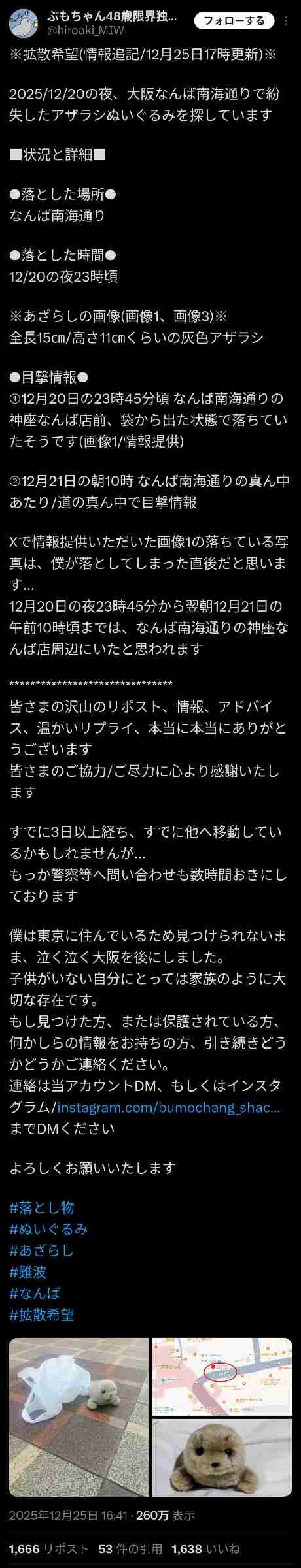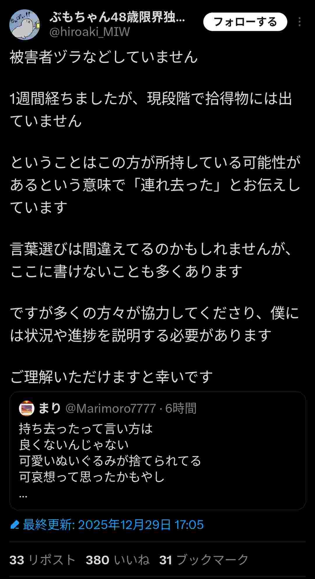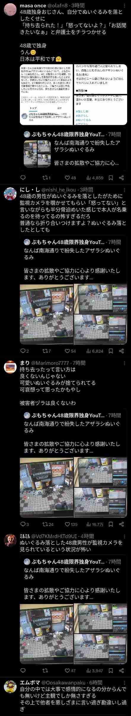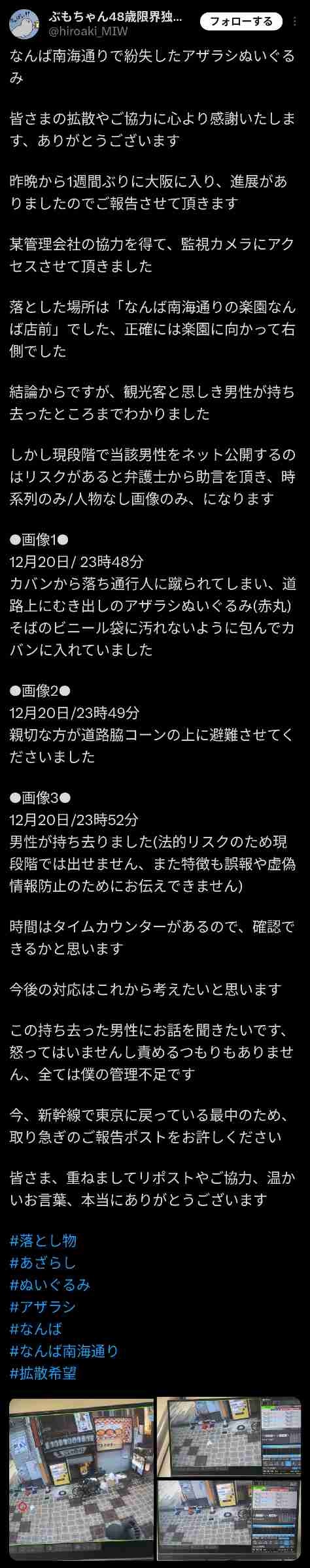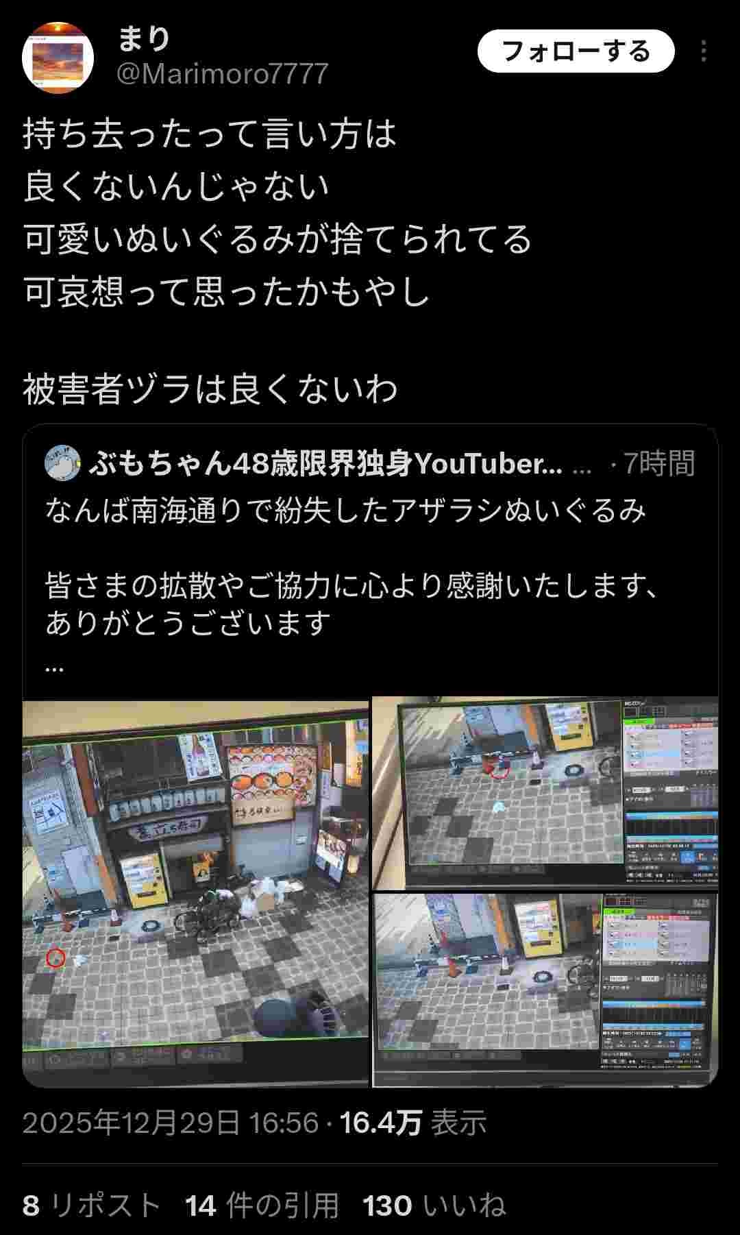 48歳独身男が路上でぬいぐるみを落とす→防犯カメラを確認し蹴られて放置されてたぬいぐるみを「連れ去られた」と騒ぎ立てる