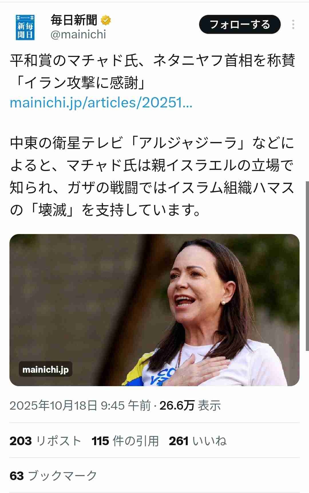 https://www.sankei.com/article/20260104-GS4XKPPBHBOLZEYJAP2A65C7ZU/トランプ米大統領は3日の記者会見で、ノーベル平和賞を昨年受賞したベネズエラの野党指導者、マリア・コリナ・マチャド氏について「国内で人気がない」と述べ、マドゥロ大統領拘束を受けた政権移行後の指導者には難しいとの見方を示した。
