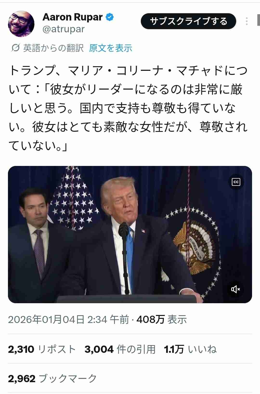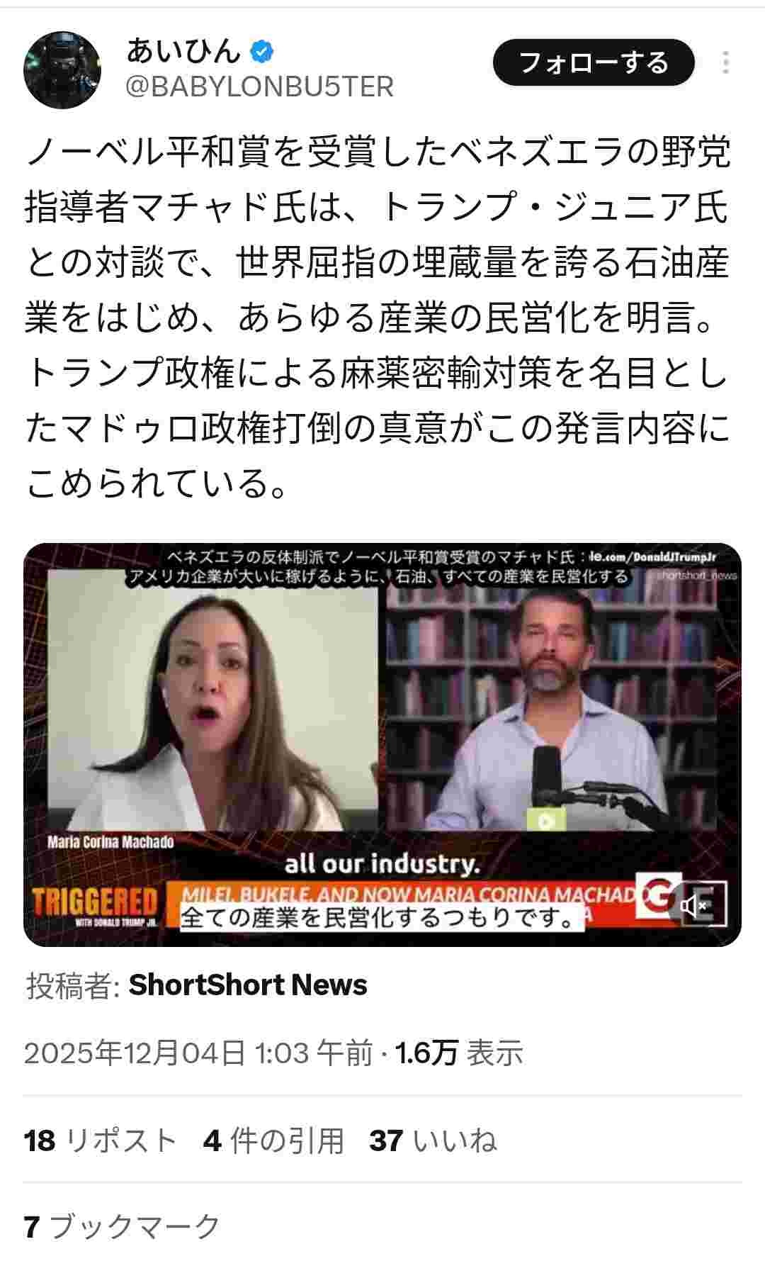 トランプの本命は野党候補のゴンザレスだろうから、活動家に過ぎないマチャドは初めから蚊帳の外なんだろう