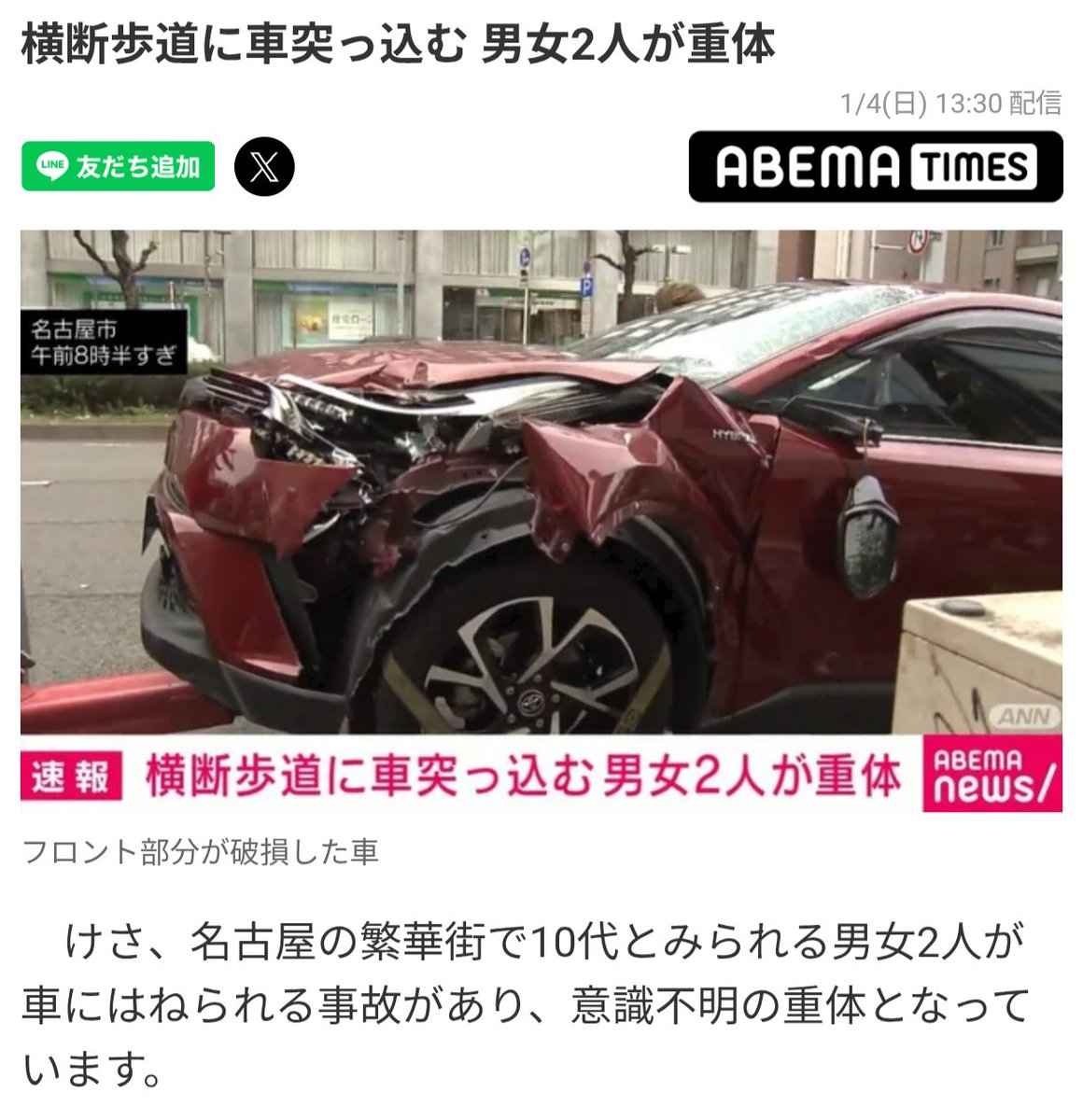 https://news.yahoo.co.jp/articles/7fed8060b600e130ba15bb69765596f27c59f4d7けさ、名古屋の繁華街で10代とみられる男女2人が車にはねられる事故があり、意識不明の重体となっています。
