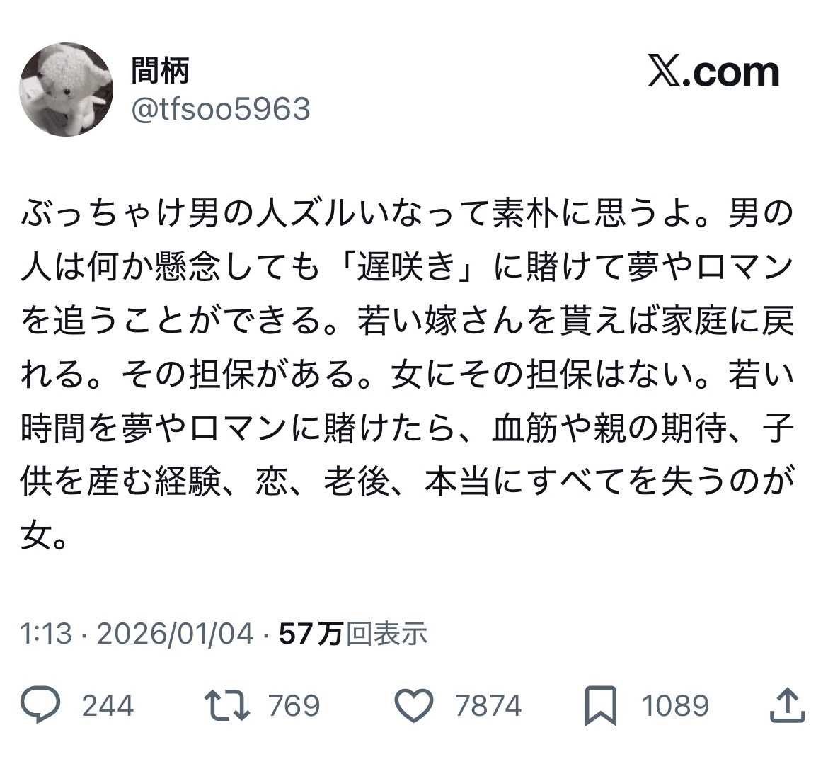 でも怠けて人生に失敗しただけの弱男と違って女性は本当に社会から迫害されてるからな