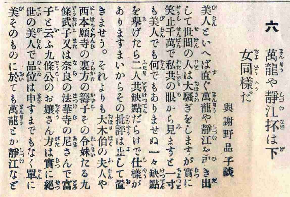 それよりも大木伯の夫人や西本願寺の裏方の籌子その令妹たる九條武子又は奈良の法華寺の尼さんで富子と云ふ九條公のお嬢ちゃん方は實に絶世の美人で品位は申すまでもなく單に美そのものに於ても萬龍とか静江など側にも寄り付かれるものでありますまい。