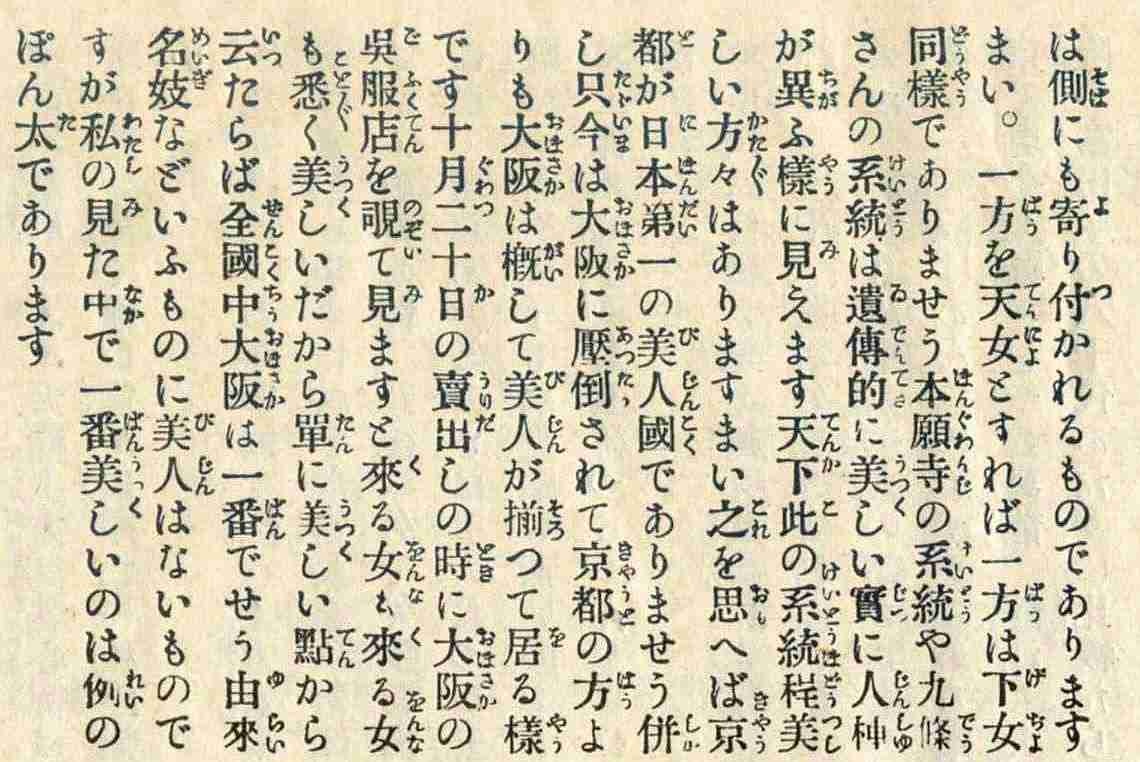 しかし只今は大阪に圧倒されて京都の方よりも大阪は概して美人が揃つて居る様です十月二十日の賣出しの時に大阪の呉服店を覗いて見ますと来る女も来る女も悉く美しいだから、単に美しい点から云たらば全國中大阪は一番でせう