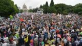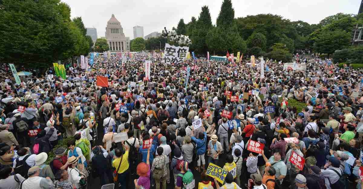 (写真)国会を取り囲み、戦争法案廃案、安倍首相退陣を求めてコールする人たち=2015年8月30日、国会正門前
