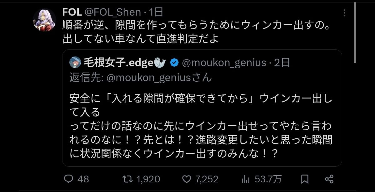 後続車曰く「俺が先にウインカー出していた」