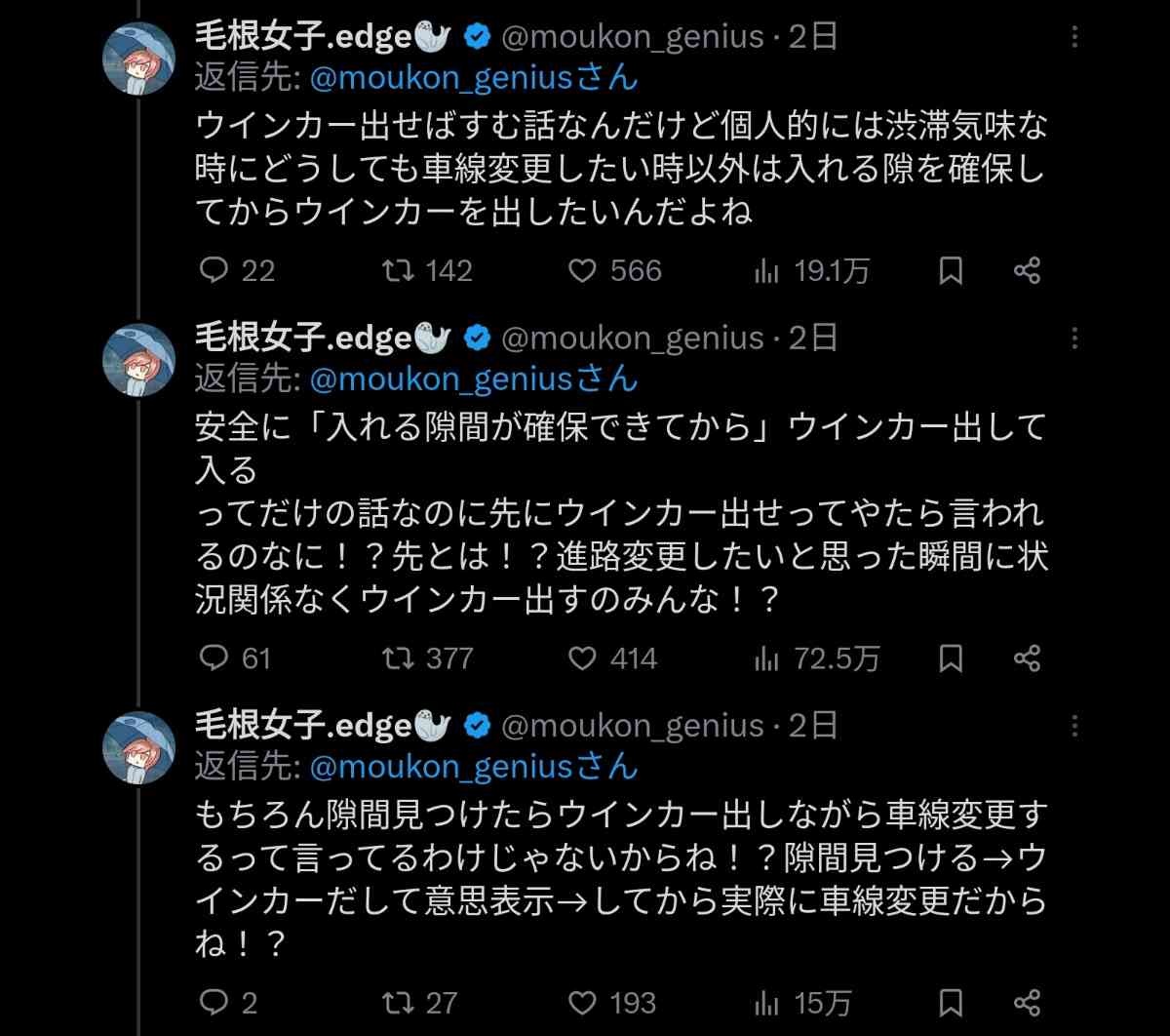 【画像】女、車線変更のウインカーを出すタイミングで炎上「入れる隙間を確保してから出す」vs「隙間を作ってもらうために先に出す」