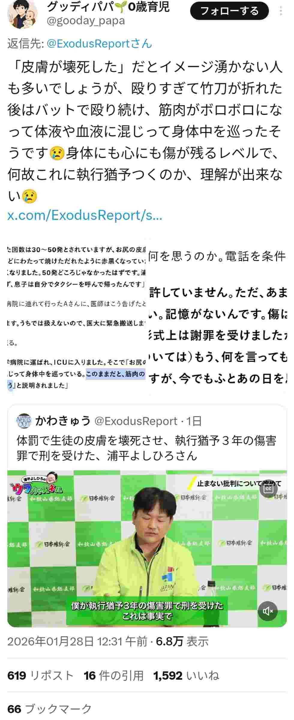 「皮膚が壊死した」だとイメージ湧かない人も多いでしょうが、殴りすぎて竹刀が折れた後はバットで殴り続け、筋肉がボロボロになって体液や血液に混じって身体中を巡ったそうです😢身体にも心にも傷が残るレベルで、何故これに執行猶予つくのか、理解が出来ない😢