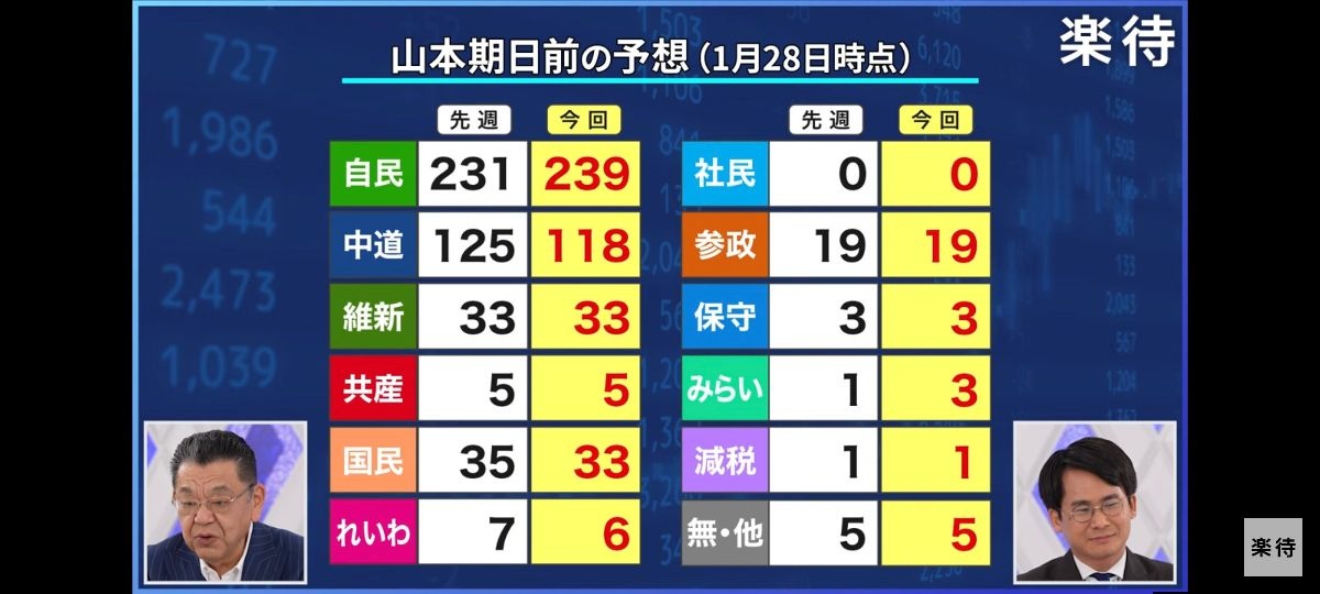 【衆院選】最新の議席予測が出る!自民239維新33中道118国民33参政19れいわ6共産5保守3みらい3ゆうこく1社民0