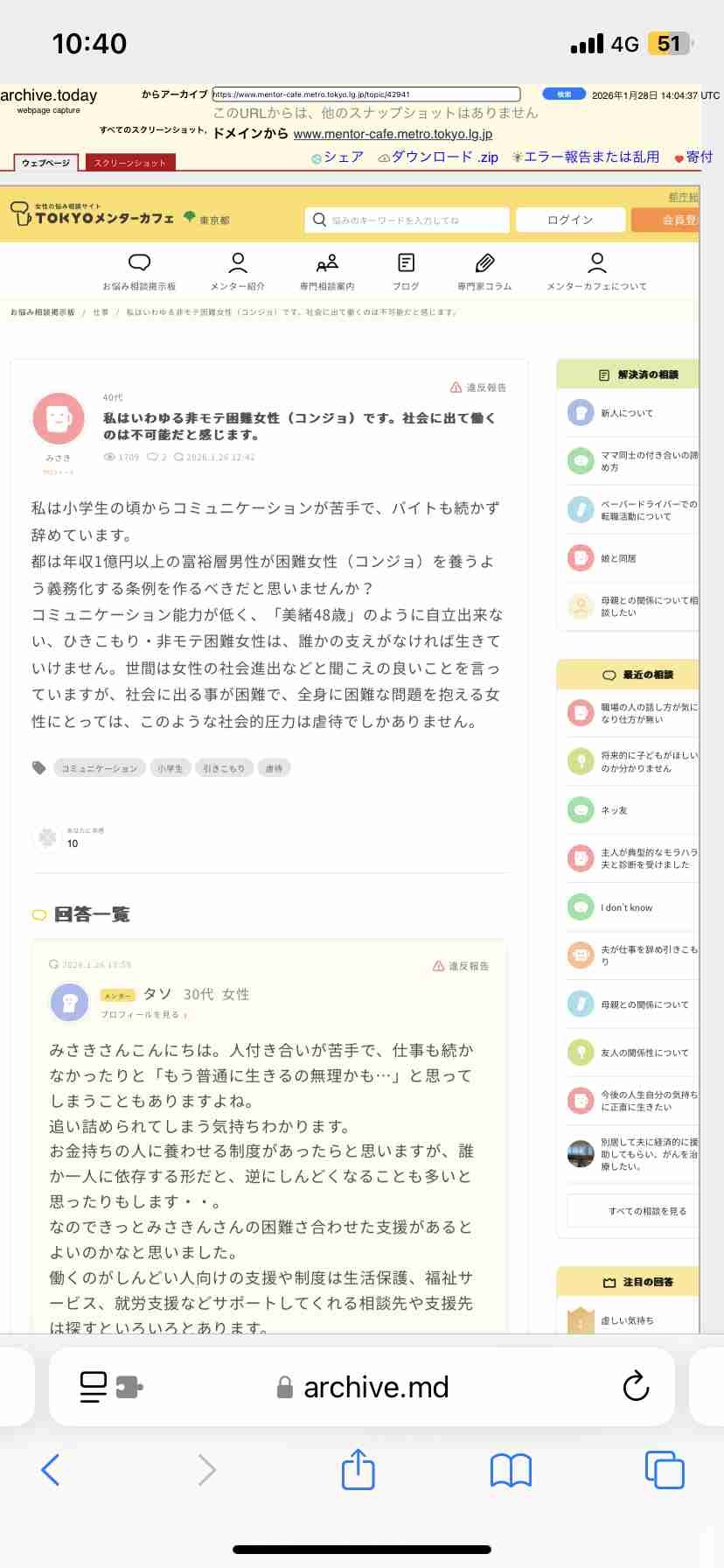 東京都が運営する女性向け悩み相談サイト「TOKYOメンターカフェ」に、ある衝撃的な投稿が寄せられ、ネット上で大炎上した。40代を自称する投稿者は、自分を「非モテ困難女性(コンジョ)」と位置づけ、「社会に出て働くのは不可能」と断言した上で、こう問いかけた。