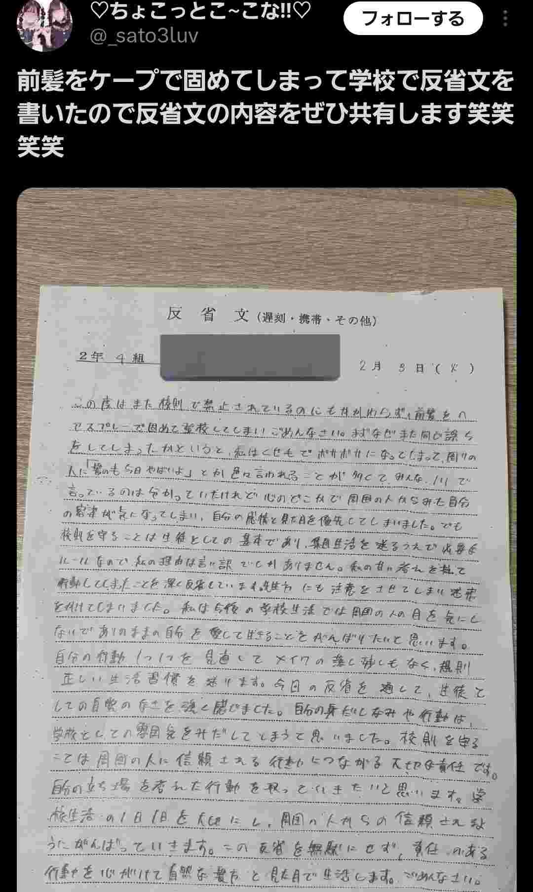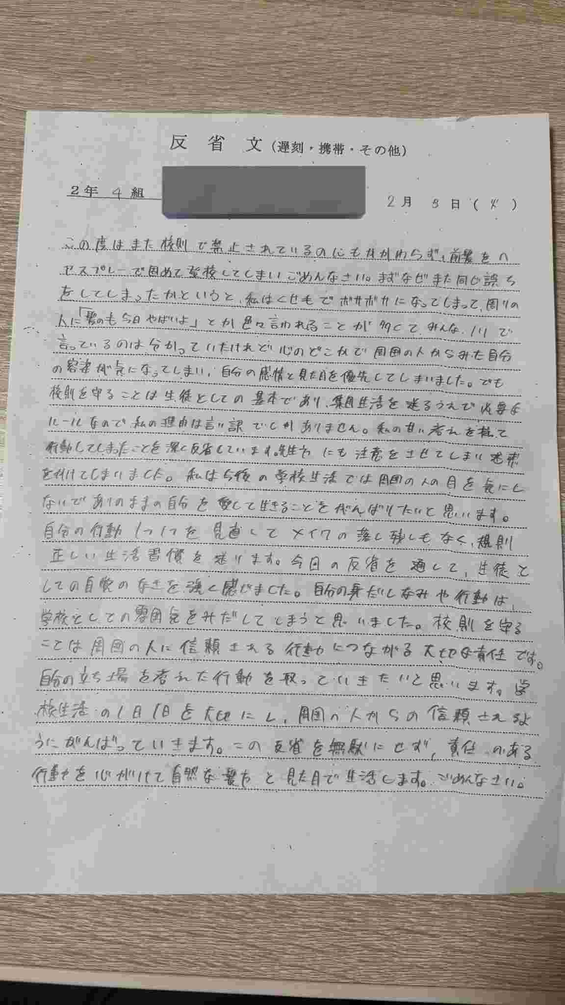 この度はまた校則で禁止されているにもかかわらず、髪型をヘアスプレーで固めて登校してしまいごめんなさい。