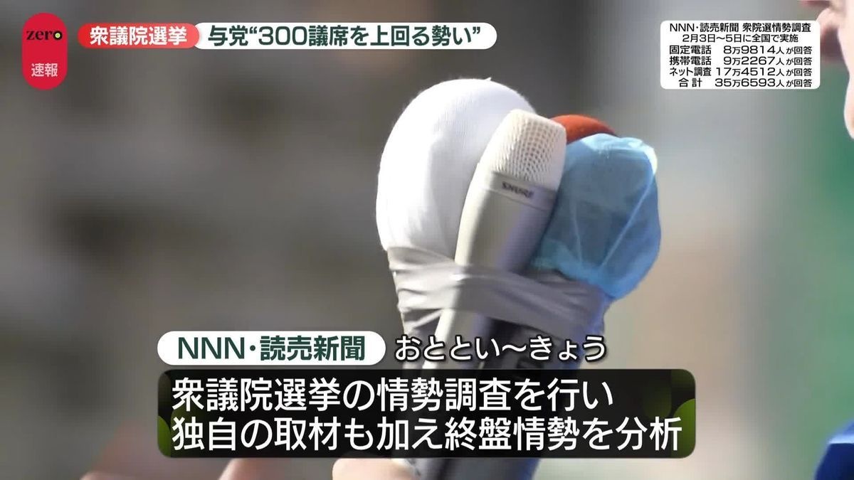 NNNは、読売新聞と衆議院選挙の情勢調査を行い独自の取材も加えて終盤情勢を分析しました。その結果、自民党と日本維新の会の与党で300議席を上回る勢いであることがわかりました。