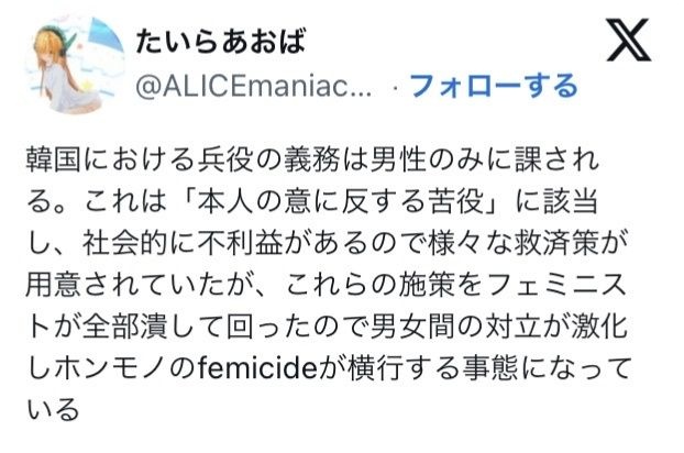 これ聞いて流石に韓国人男性に同情したわ