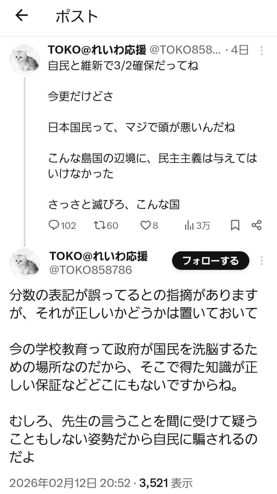 多くの人間が共有してる約束事を無視して独りよがりな記法を押し付けるってその姿勢がまさにれいわ信者らしくてかわいいね