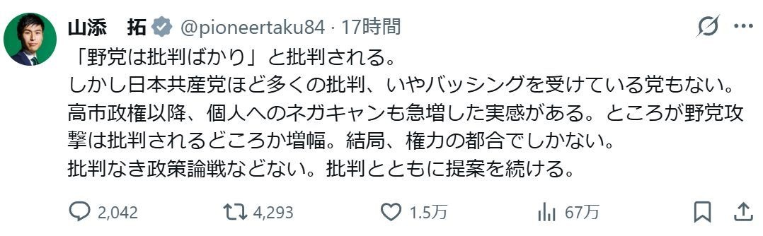 共産・山添拓氏“「野党は批判ばかり」批判”に「日本共産党ほど多くの批判を受けてる党もない」