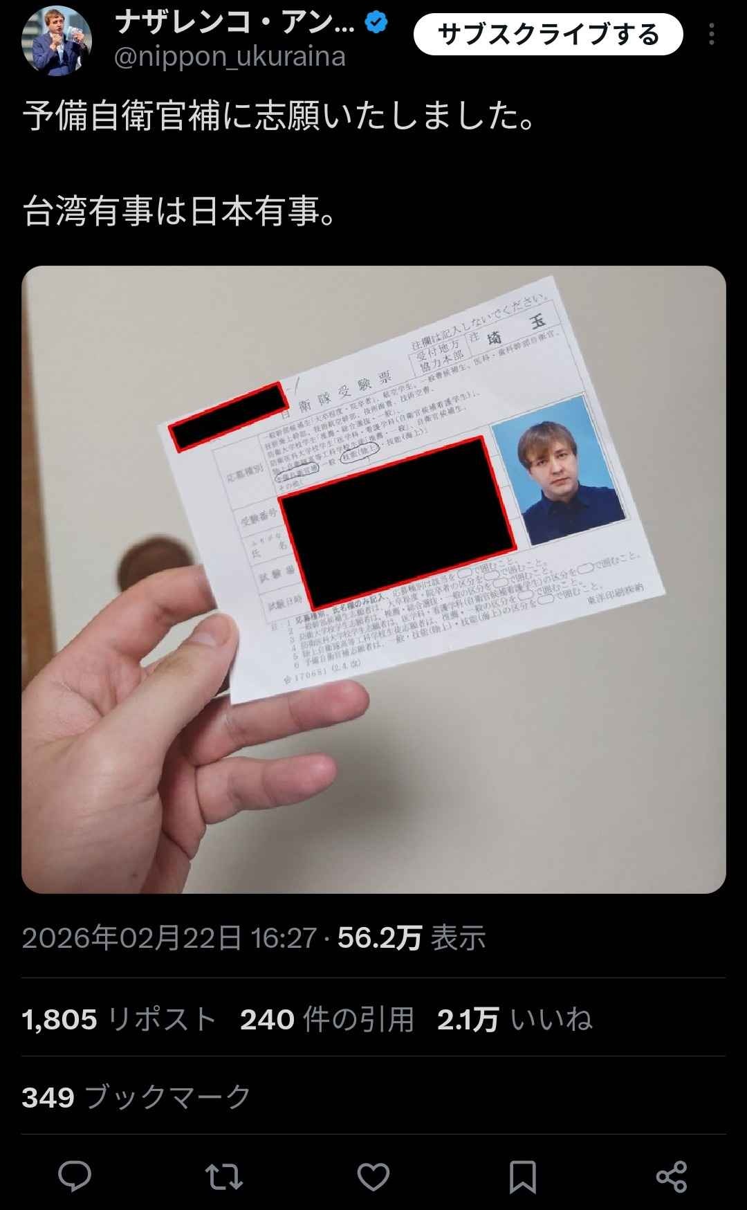 予備自衛官補に志願いたしました。台湾有事は日本有事。