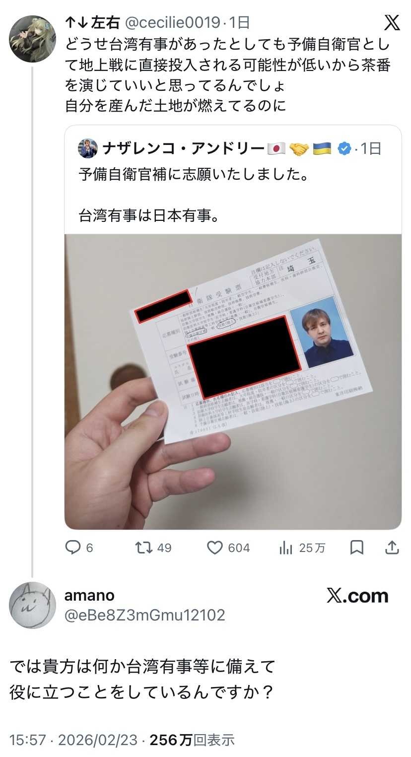 現に侵略されて交戦してた母国には意地でも帰らず帰化した国の予備自衛官志して有事に備えますとかなんの冗談だろうな
